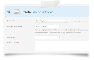 For creating a new purchase order for a supplier, follow either the link from the navigation menu or the shortcut in the dashboard, and you'll be directed to a simple form where you have to enter the job number, delivery address and the add the products from the selection boxes as shown, and finally click the "Add This Product" button to add subsequent items to your purchase order button and save the purchase Order , and you're done.