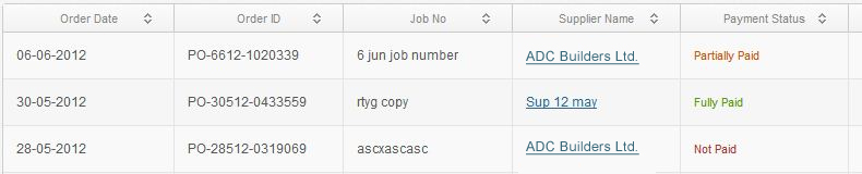 Following the link in the navigation menu, you can easily have access to all the purchase order information in your database. The tabular information gives you a quick look at all the purchase orders, including the color coded payment status for quick identification of paid, pending or partially paid purchase orders.